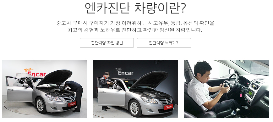 엔카에서는 중고차를 구매할 때 가장 어려워하는 사고유무, 등급, 옵션 등의 확인 사항을 전문가가 직접 진단하고 엄선하여 전시한다고 합니다.
