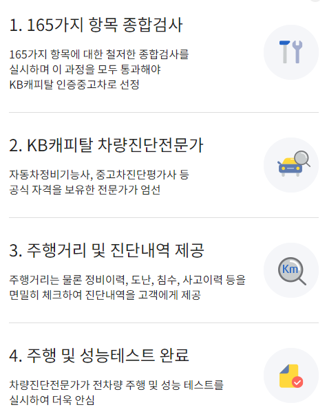 차량진단전문가가 직접 선별하고 검사를 진행합니다. 총 165가지 항목을 종합 검사하고 주행거리 및 진단 내역을 제공합니다. 또한 주행 및 성능 테스트까지 시행한 차량을 판매한다고 합니다.