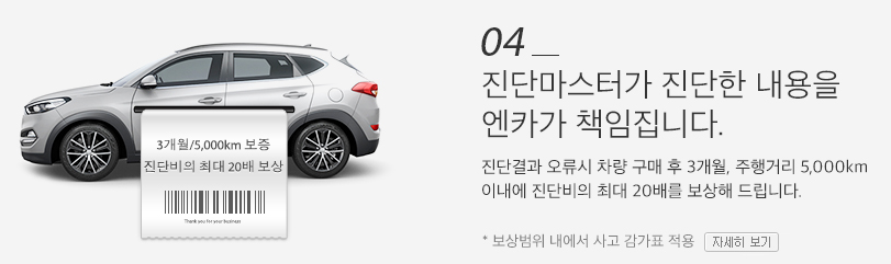 차량 가격을 결정짓는 등급과 옵션을 정확하게 확인하고 기입합니다. 또한 진단 마스터가 진단한 내용에 대해서 엔카가 책임을 진다고 합니다. 구매 후 3개월, 주행거리 5,000km 이내에 진단비의 최대 20배까지 보상을 지급한다고 합니다.