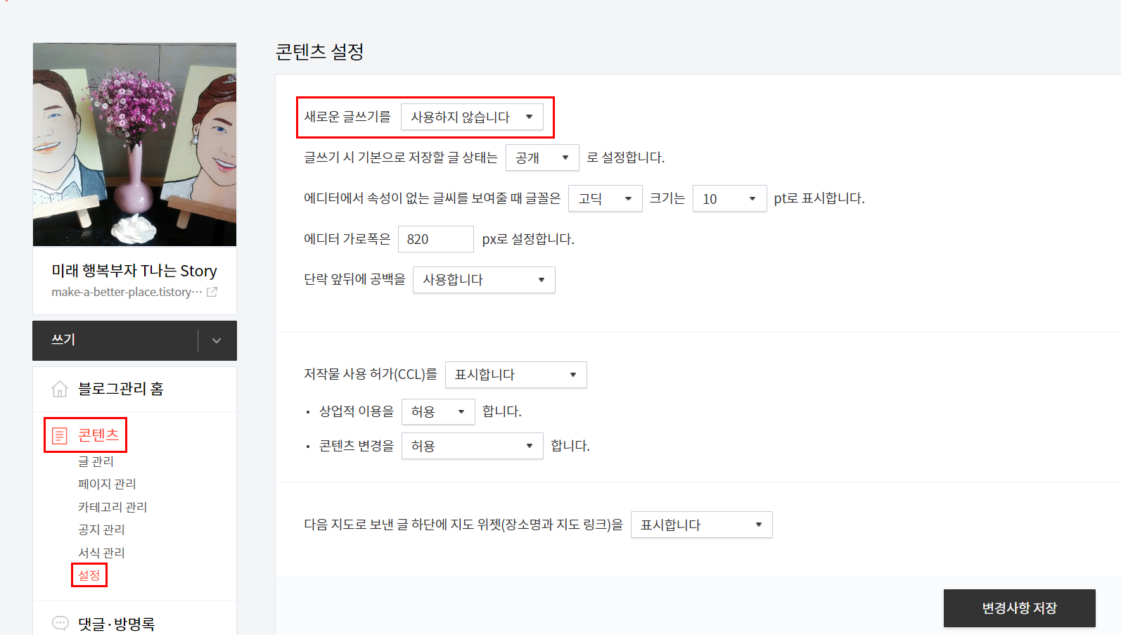 7. 자신의 Tistory 블로그를 들어가 [콘텐츠] → [설정]을 누른 후 새로운 글쓰기를 [사용하지 않습니다.]를 선택합니다. 그리고 [변경사항을 저장]하도록 합니다.