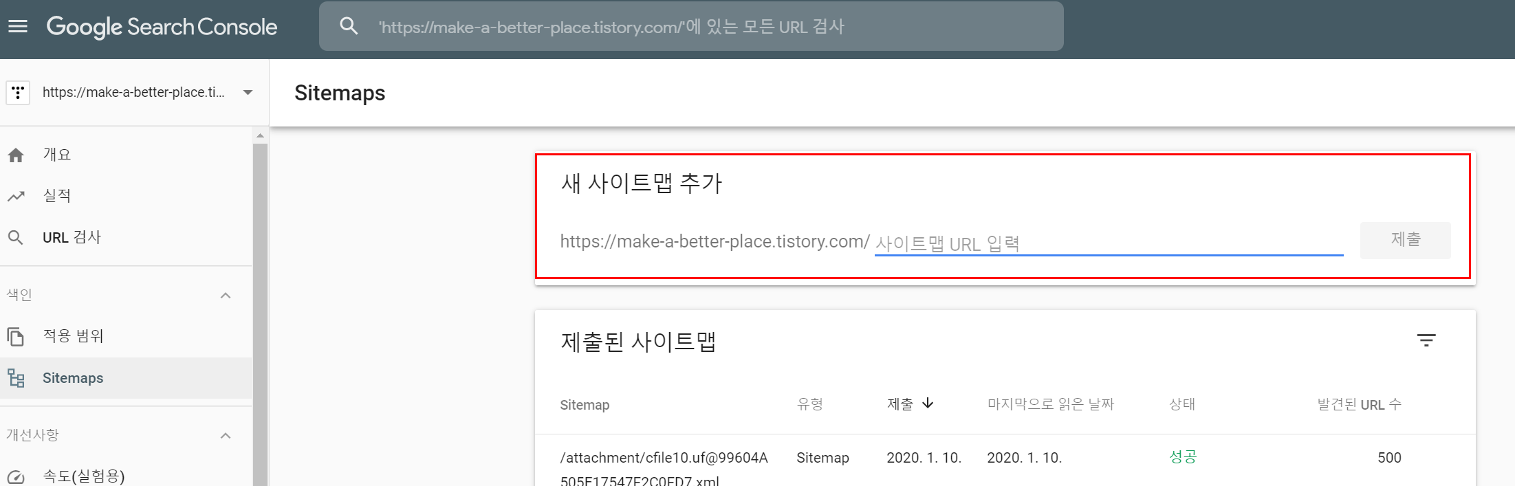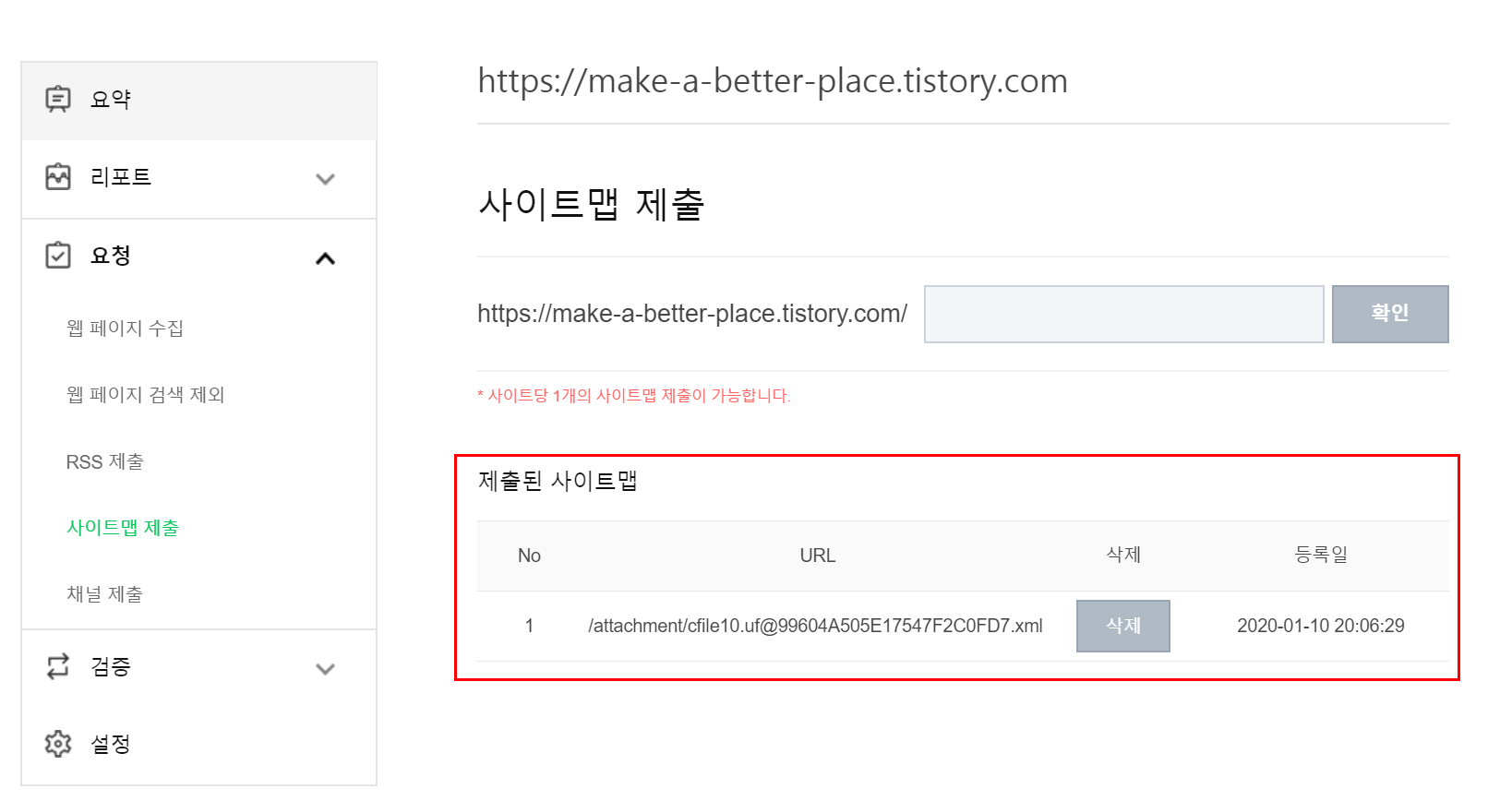 위에서 설명드렸듯이 6. 번의 콘텐츠 설정을 안 바꾸면 어떻게 되는지 한번 보여 드리겠습니다. 아래와 같이 전혀 다른 주소가 나오는 것을 볼 수 있습니다. 아래와 같은 주소 형식으로는 사이트맵을 등록할 수 없기 때문에 설정을 바꾸라고 하였습니다.
