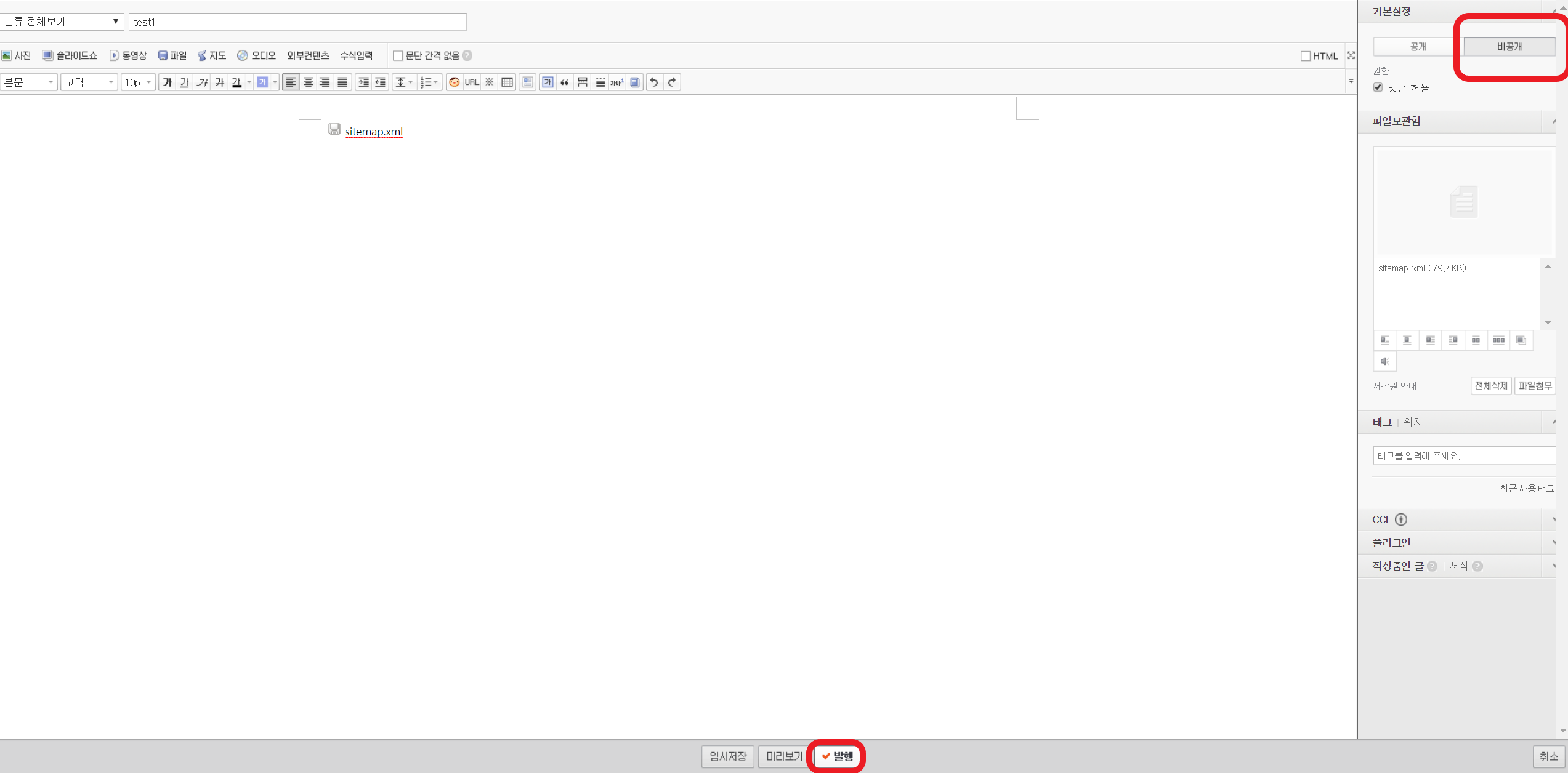 8. TISTORY 글쓰기를 누르면 옛날 글쓰기 서식창이 나타납니다. 여기서 [파일]을 누르면 아래 파일 첨부창이 뜹니다. [파일 선택]을 누른 후, 아까 전에 저장한 sitemap.xml을 선택하여 첨부합니다. 그리고 [등록]을 누릅니다.