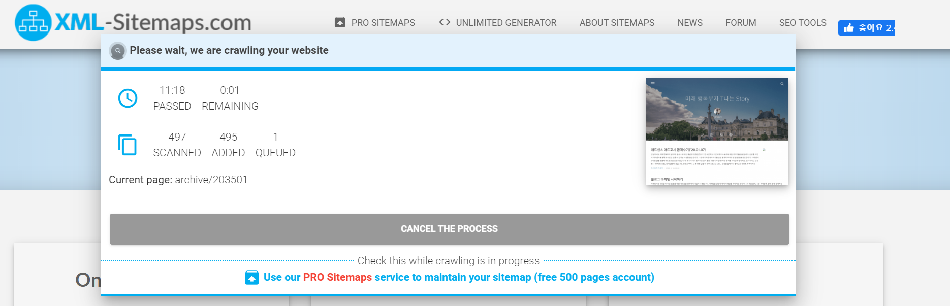 제 티스토리에 콘텐츠가 많이 없는 상황에도 거의 20분 가까이 걸렸습니다. Remaining 시간이 1초에서 ~3초를 계속 왔다갔다하면 10분 정도 더 걸렸습니다. 처음에는 제 사이트가 이상한 줄 알았는데 그건 아니었으니 인내심을 가지고 기다려주세요.