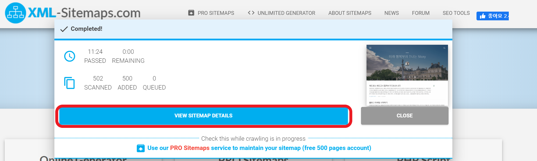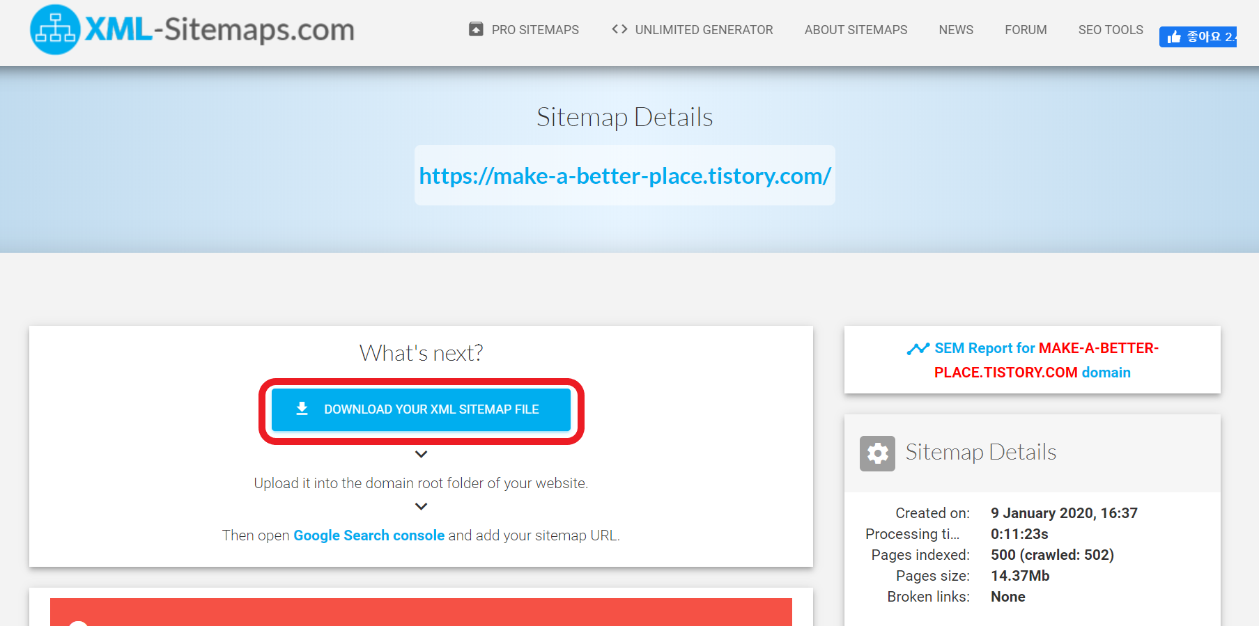 5. 아래와 같은 그림이 나오면 DOWNLOAD YOUR XML SITEMAP FILE을 누릅니다.