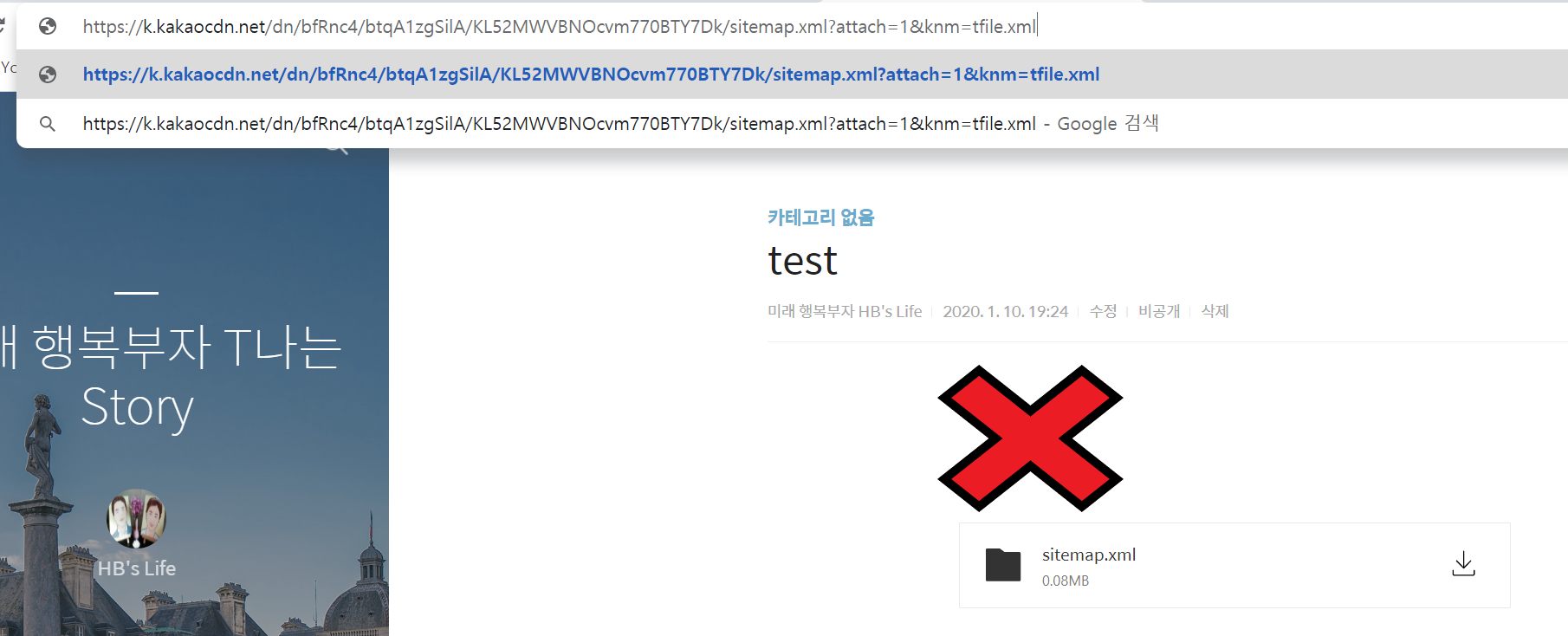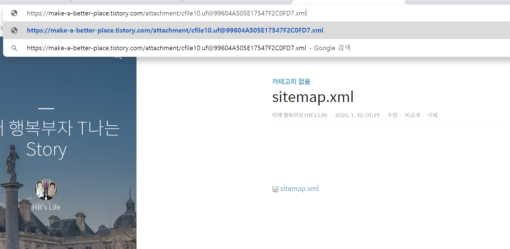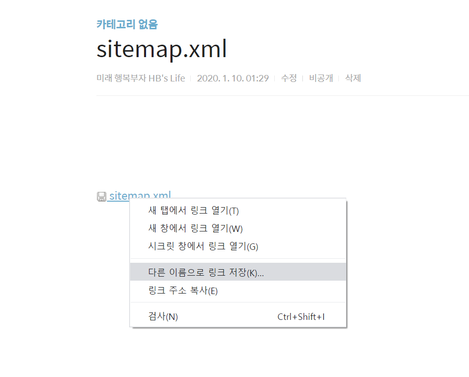 10. 발행된 글로 들어가서 sitemap.xml 파일에 마우스 오른쪽 버튼을 누릅니다. 그리고 [다른 이름으로 링크 저장]을 누릅니다.