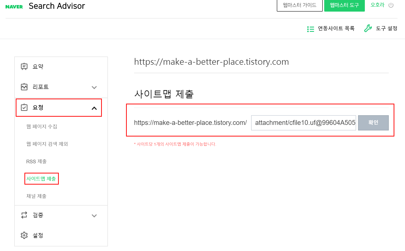 12. 먼저 네이버 서치 어드바이저로 들어가셔서 웹마스터 도구를 선택합니다. 여기서 [요청] 선택 후 [사이트맵 제출]을 클릭합니다. 사이트맵 제출 화면에서 아까 복사한 링크를 붙여 넣기 합니다. 복사한 링크 앞부분에 자신의 블로그 주소를 지우고 [attachment~ ] 부분부터 주소를 남겨줍니다. [확인]을 누릅니다.