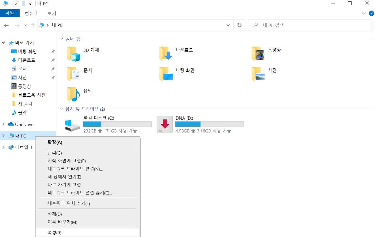 1. [내 PC] 마우스 오른쪽 버튼을 누른 후 [속성] 선택 합니다.