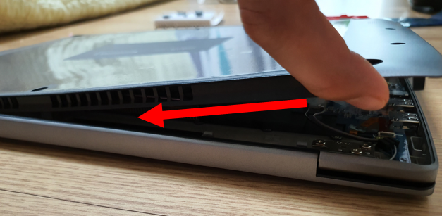 6. 힌지 부분에서 화살표 방향으로 손이 가면서 조금씩 조금씩 뜯어줍니다.