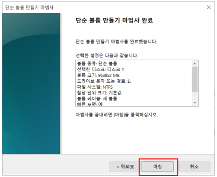 Tip. 여러 개의 하드디스크를 만들려면 단순 볼륨 크기(MB)(S)를 원하는 크기만큼 설정하면 됩니다. [그리고 남는 용량은 단순 볼륨 만들기 마법사를 다시 한번 본 과정과 똑같이 진행하여 만들면 됩니다.]