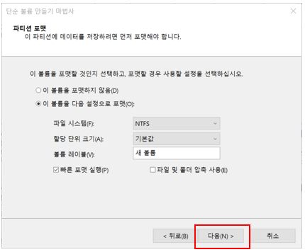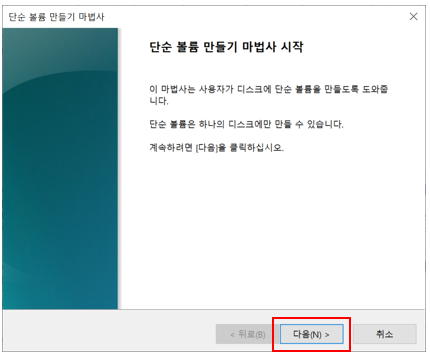 5. 단순 볼륨 만들기 마법사 시작입니다. 여기서 [다음(N)]을 선택합니다.