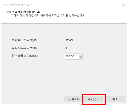 6. 단순 볼륨 크기(MB)(S)를 최대 디스크 공간 크기와 같게 하시고 [다음(N)]을 선택합니다.