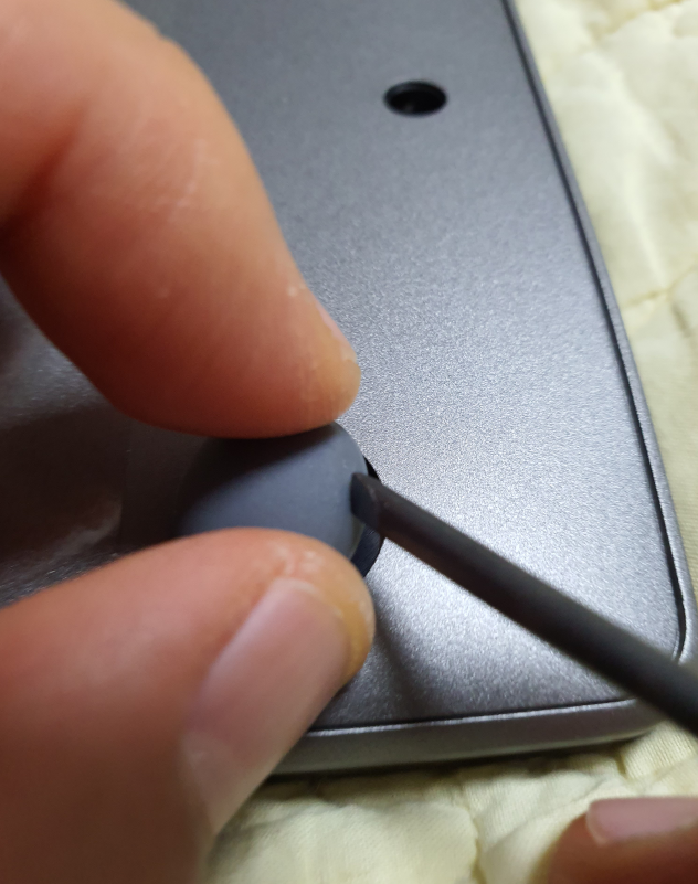 * Tip 하판 고무판의 경우 1자 드라이버 굵은 것으로 힘 있게 지속적으로 밀어주며, 반대편 손으로 드라이버 밀어주는 방향으로 손을 계속 잡아당깁니다. 그러면 양면테이프 떨어지는 소리(지이익~)가 들립니다. 생각보다 강한 힘으로 주욱 당겨주어야 합니다.